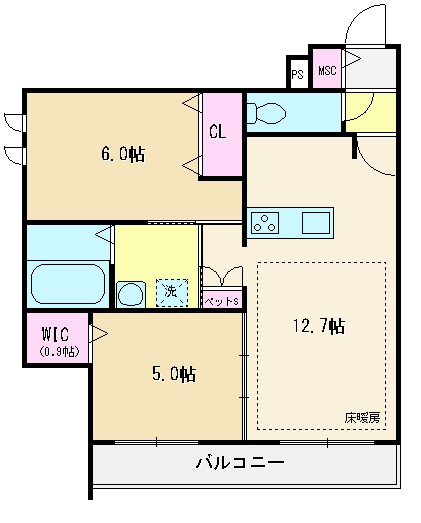 間取り | 2LDK | 間取り詳細 | 洋室6帖・洋室5帖・LDK12.7帖 | 専有面積 | 57.05㎡ |